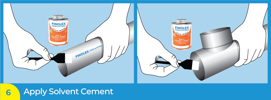 6. Solvent Cement: Apply even cement layer on pipe and inside fitting.